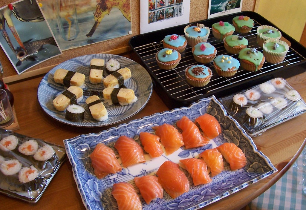 21日の日曜は息子のサッカーの試合がないと聞いていたので、 もうすぐ東京に赴任する英人の友人夫婦を招待しました。 ところが、息子のサッカーが行われることになったのは、先週の月曜日のこと。 もう呼んじゃったから、招くしかありません。 息子の送迎はチームメイトに頼みましたが、 一番弱いと思っていたチームに7対3で負け。 前回の戦力よりも脚の速い選手を2名補強したそうです。 やはり、息子チームはディフェンダーに問題あるなあ。 試合では左MFの息子のところまで球が飛んで来ないんだそうです。 おまけに新戦力のアダムが大怪我。 悲しいことは以上ですが、 楽しかったことは、東京に行く友人家族との団欒でありました。 食事が旨く出来たであります。 前菜に出した味噌味チャーシュー。味噌と醤油をベースにしたタレに一晩漬けてからオーブン焼き。薄切りにしたものを舌に乗せると、脂と味噌が溶けて・・・。 これまた前菜。スモークサーモンの刺身ですと、英人には抵抗が少ないようです。他は卵とキウリの海苔巻き。どぎつい色したトリークル(カップケーキ)は息子が作ったもので、小さな子ども用のデザートです。 この他にもメインディッシュがありましたが、 英式はどう撮っても旨そうに見えませんので割愛。